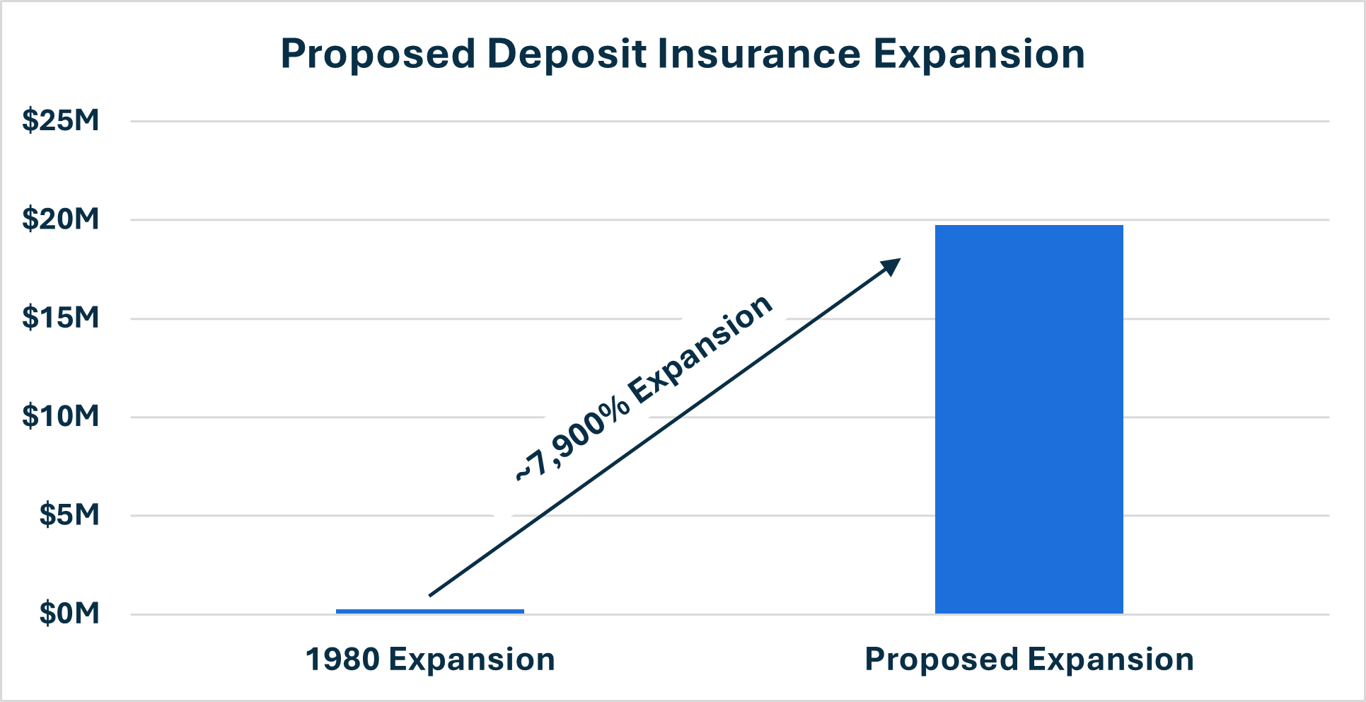 Recent discussions of expanding deposit insurance for small and mid-sized banks make the 1980 deposit insurance expansion look trivial by comparison. In the chart below we compare the relative size of the 1980 increase with the proposed increase that would raise the FDIC limit for some accounts from $250,000 to $20 million, representing a 7,900 percent increase in FDIC coverage.