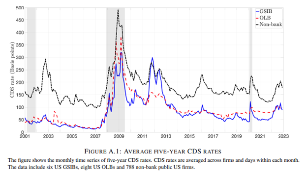 The paper examines the cost of purchasing insurance against the default of a U.S. Global Systemically Important Bank (GSIB) in the credit default swap, or “CDS,” market over the 2001-2022 period. The primary data source that drives the paper’s finding is re-produced below.