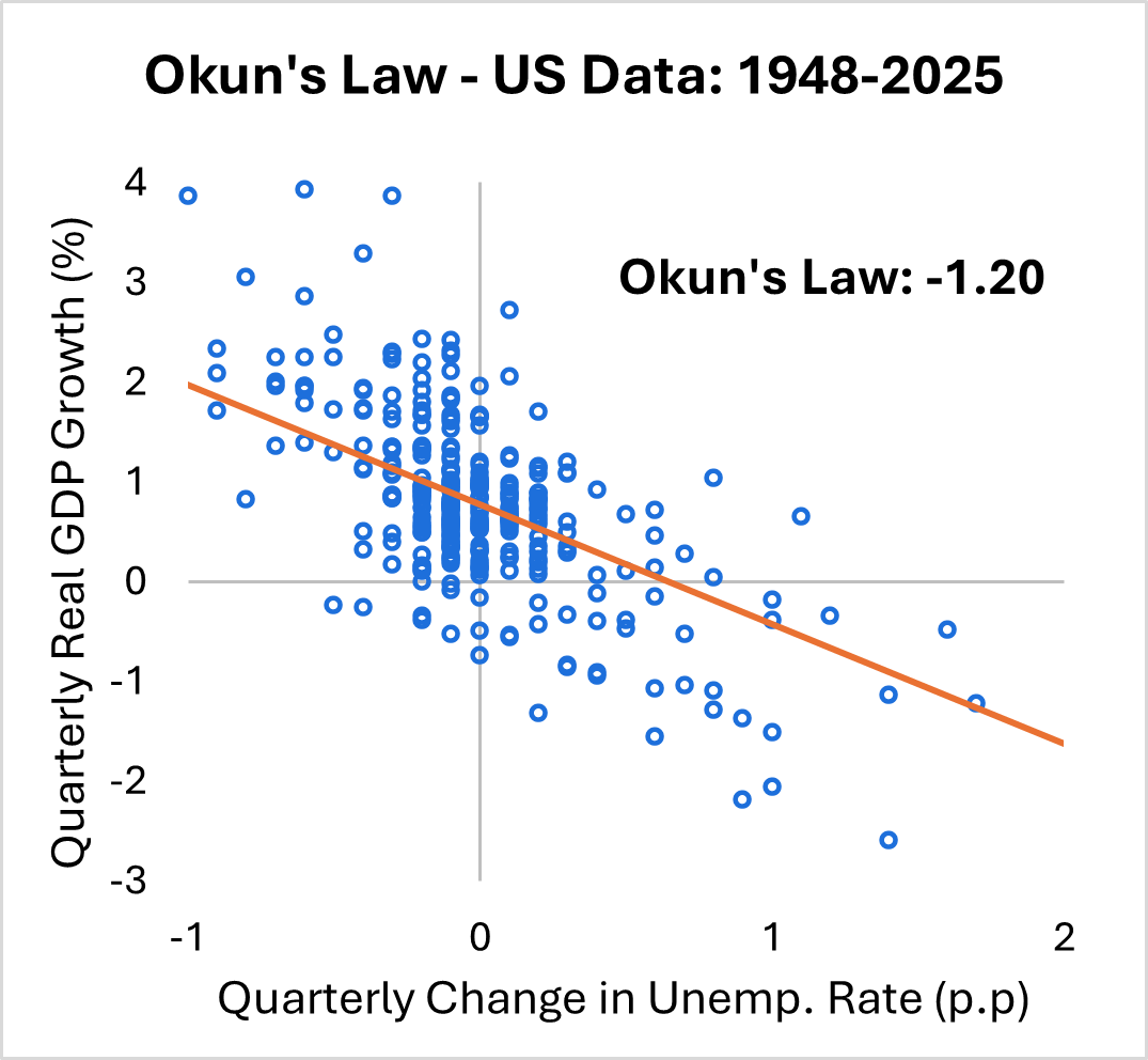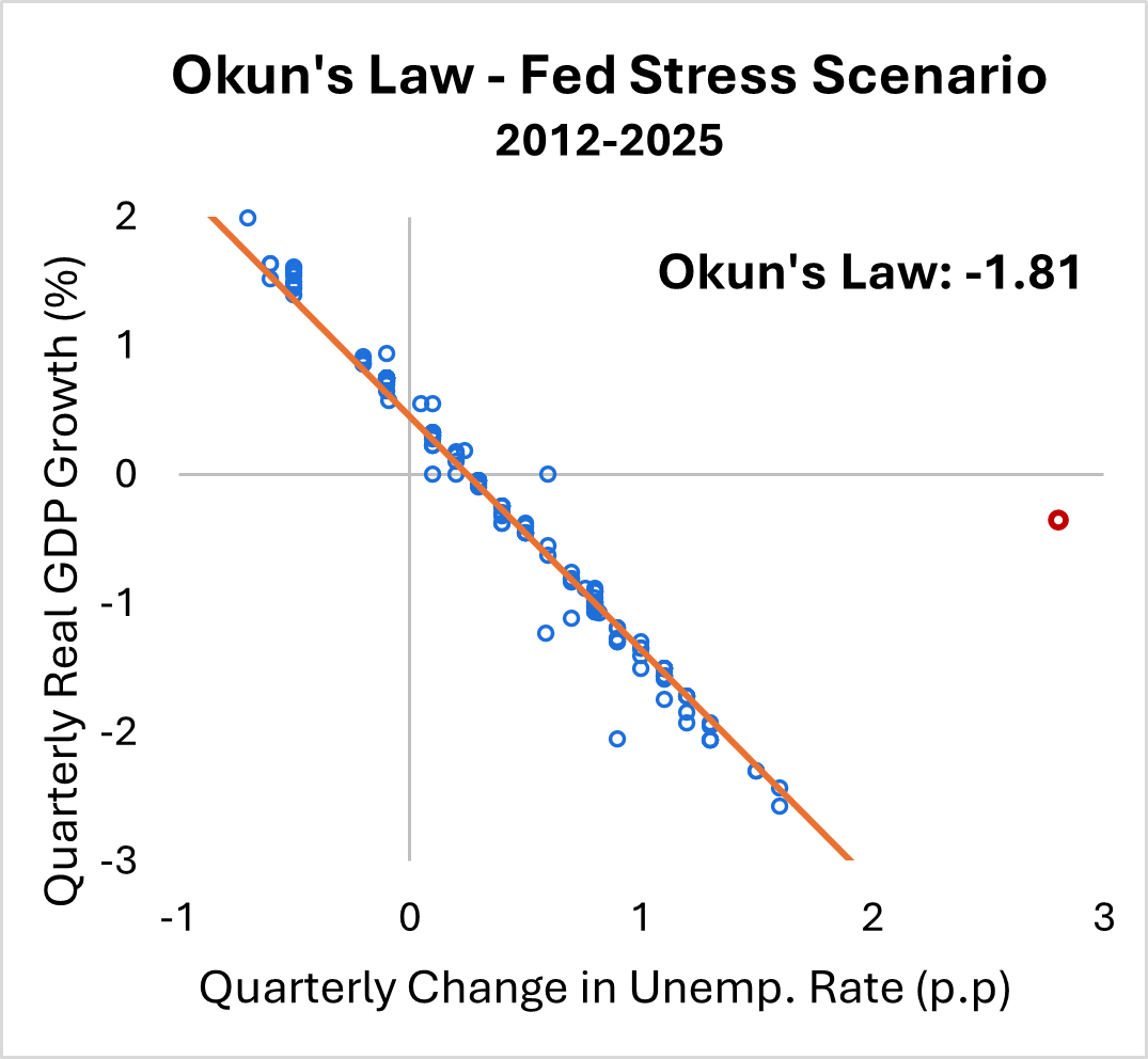 Finally, two points worth noting. First, note how the data points are tightly clustered around the Okun’s Law line in the right-hand panel. This high degree of association indicates that the severe Okun’s Law relationship is not the result of one or two outliers but is a systematic feature of the 2012-2025 FRB scenario design methodology. Second, note the red dot to the extreme right of the chart. This is a clear outlier observation that has been removed from the analysis and dates back to the 2022 scenario in which the FRB posited that unemployment would rise by 2.8 percentage points in a single quarter without any significant decline in GDP. The outlying and idiosyncratic nature of this data point strongly suggests that considerations beyond a simple Okun’s Law rule were at play, so we do not include it in our analysis.
