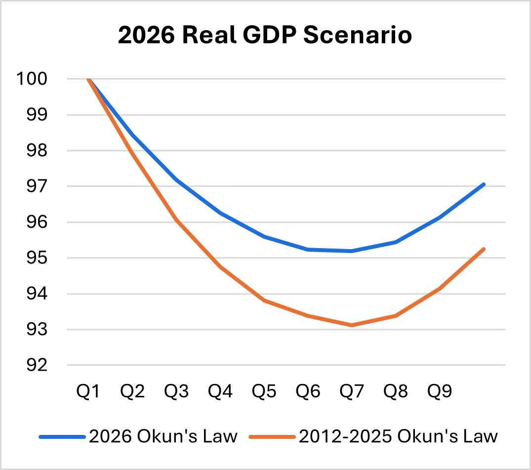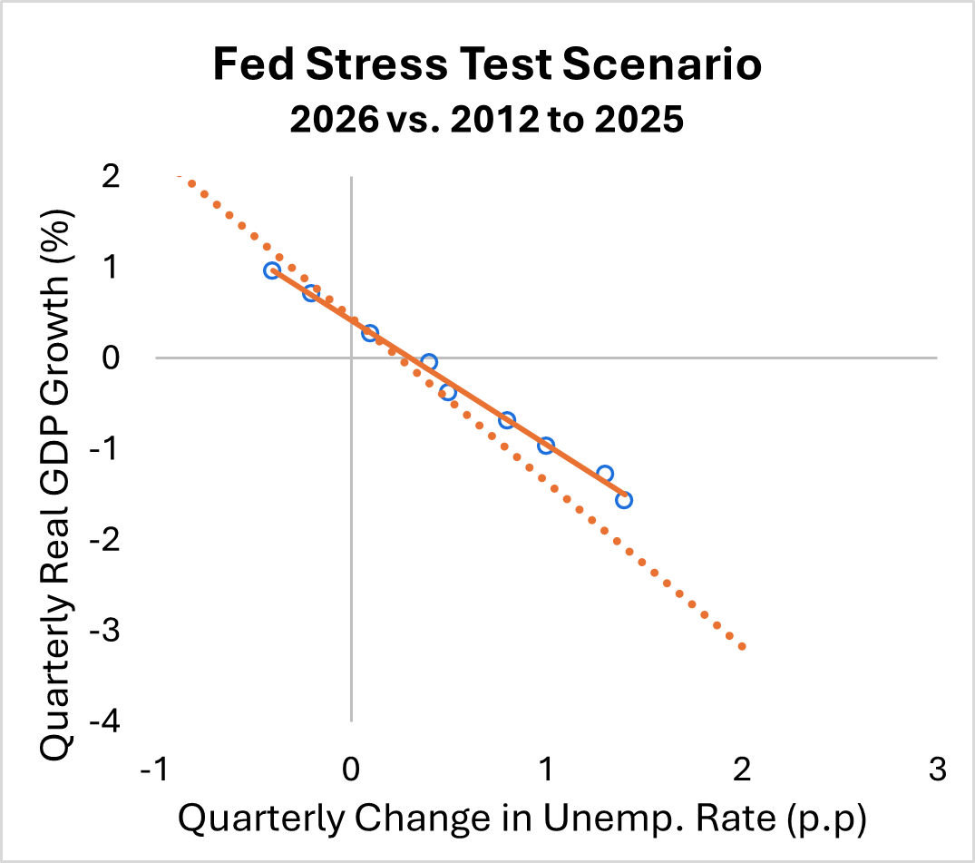 Below, we show two figures that underscore how the 2026 FRB real GDP scenario path differs from the 2012-2025 experience. The left-hand panel shows the new Okun’s Law relationship (the solid line) along with the nine quarters of unemployment and real GDP from the 2026 stress scenario. Superimposed over this plot is the Okun’s Law relationship (dotted line) that characterized the FRB stress scenario from 2012-2025. The right-hand panel shows the real GDP path from the 2026 scenario (blue line) and the real GDP path that would have resulted had the FRB used the 2012-2025 Okun’s Law relationship to specify the 2026 real GDP path (orange line).